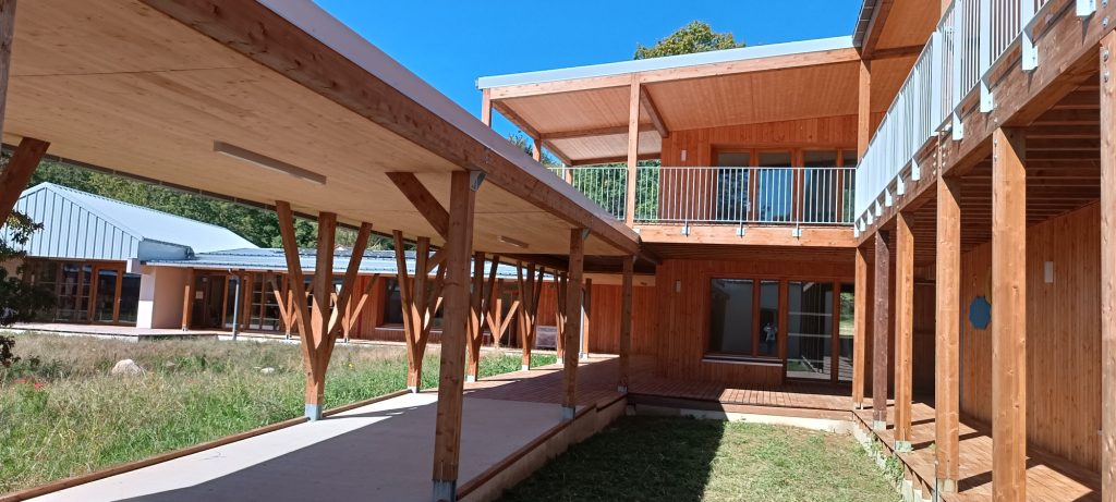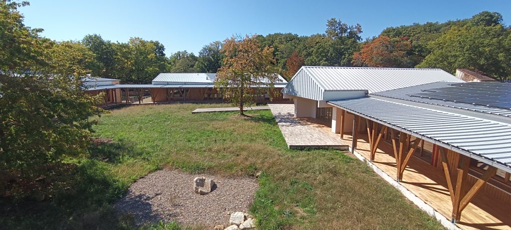Le nouveau centre de loisirs de Limoges, implanté sur l’ancien camping du lac d’Uzurat, incarne une approche architecturale exemplaire, à la croisée du fonctionnel, du durable et du paysager. Le projet articule six constructions neuves et deux bâtiments réhabilités, intégrés avec soin à un site naturel riche, entre lac et bois. La conception bioclimatique s’appuie sur des matériaux biosourcés (ossature bois, isolation en paille), des éléments de réemploi (parquet, menuiseries, etc) et une gestion optimisée des ressources (énergie solaire, récupération des eaux pluviales). L’ensemble est pensé pour minimiser l’impact environnemental tout en créant des espaces adaptés aux usages éducatifs et ludiques des enfants. L’implantation respecte les arbres existants, valorise les continuités écologiques et favorise le confort d’été grâce à une végétalisation renforcée. Le projet est labellisé Bâtiment Durable Nouvelle-Aquitaine, une première dans sa catégorie sur le territoire limousin.